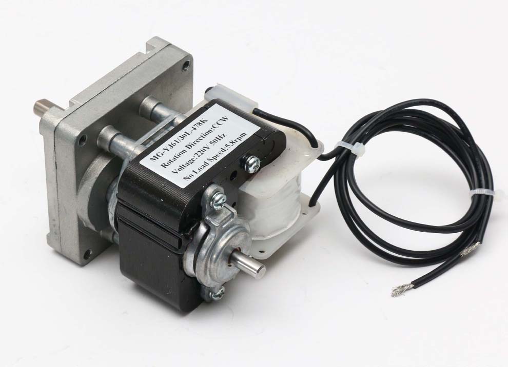 Ein Asynchronmotor mit integriertem Getriebe, der über mechanische Untersetzung aus AC-Eingang eine drehzahlreduzierte, drehmomentverstärkte Rotation erzeugt. Nutzt einen Kurzschlussläufer für den Anlauf und einen permanent gesplitterten Stator für Einphasenbetrieb.